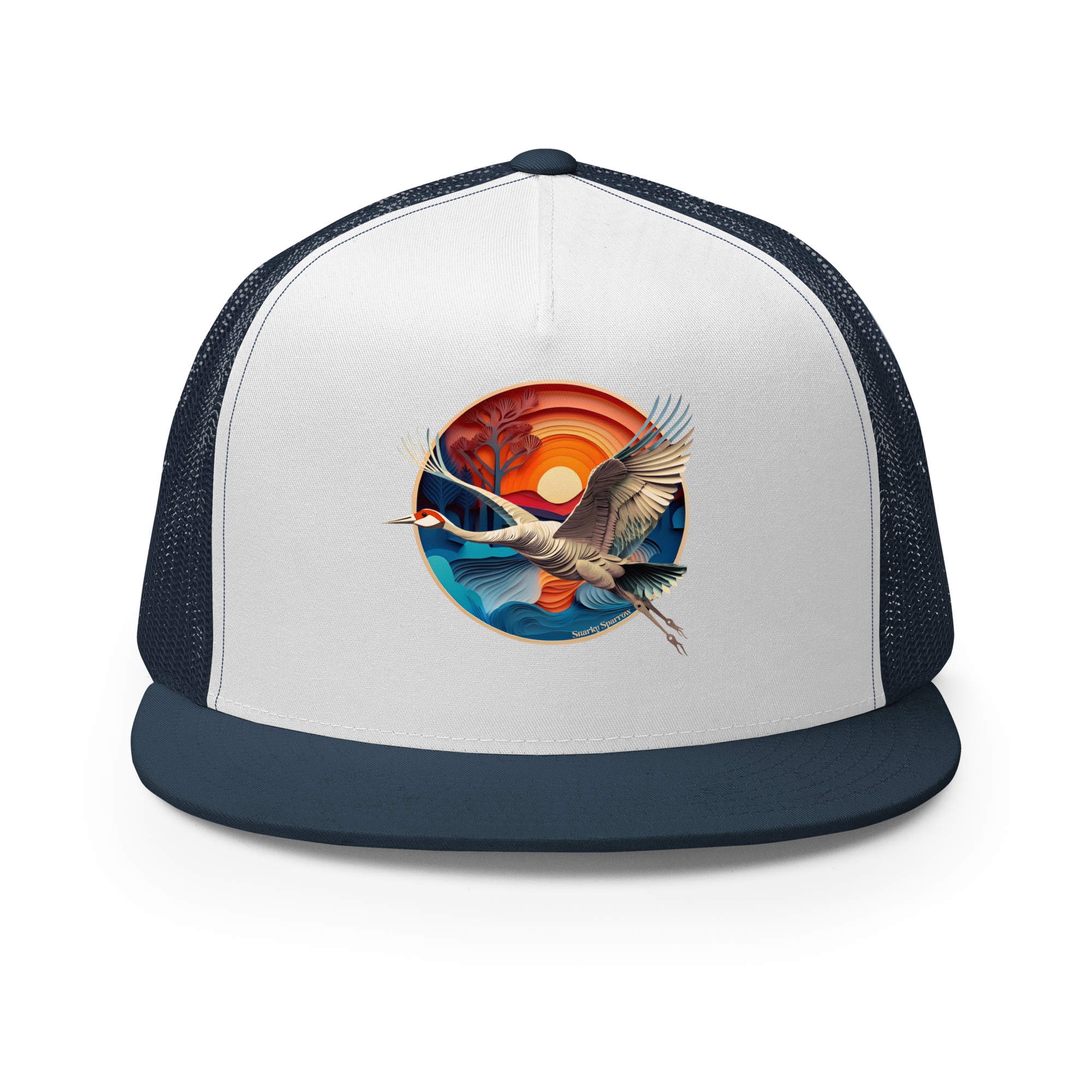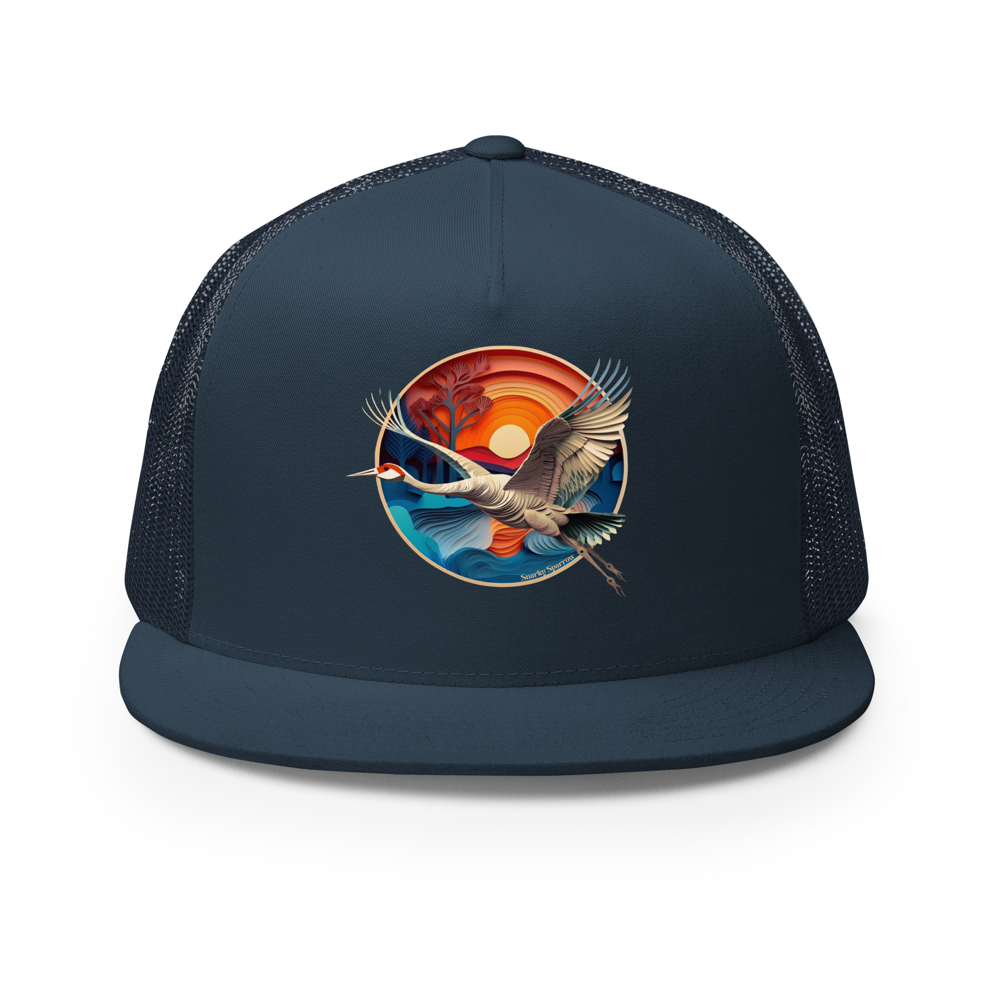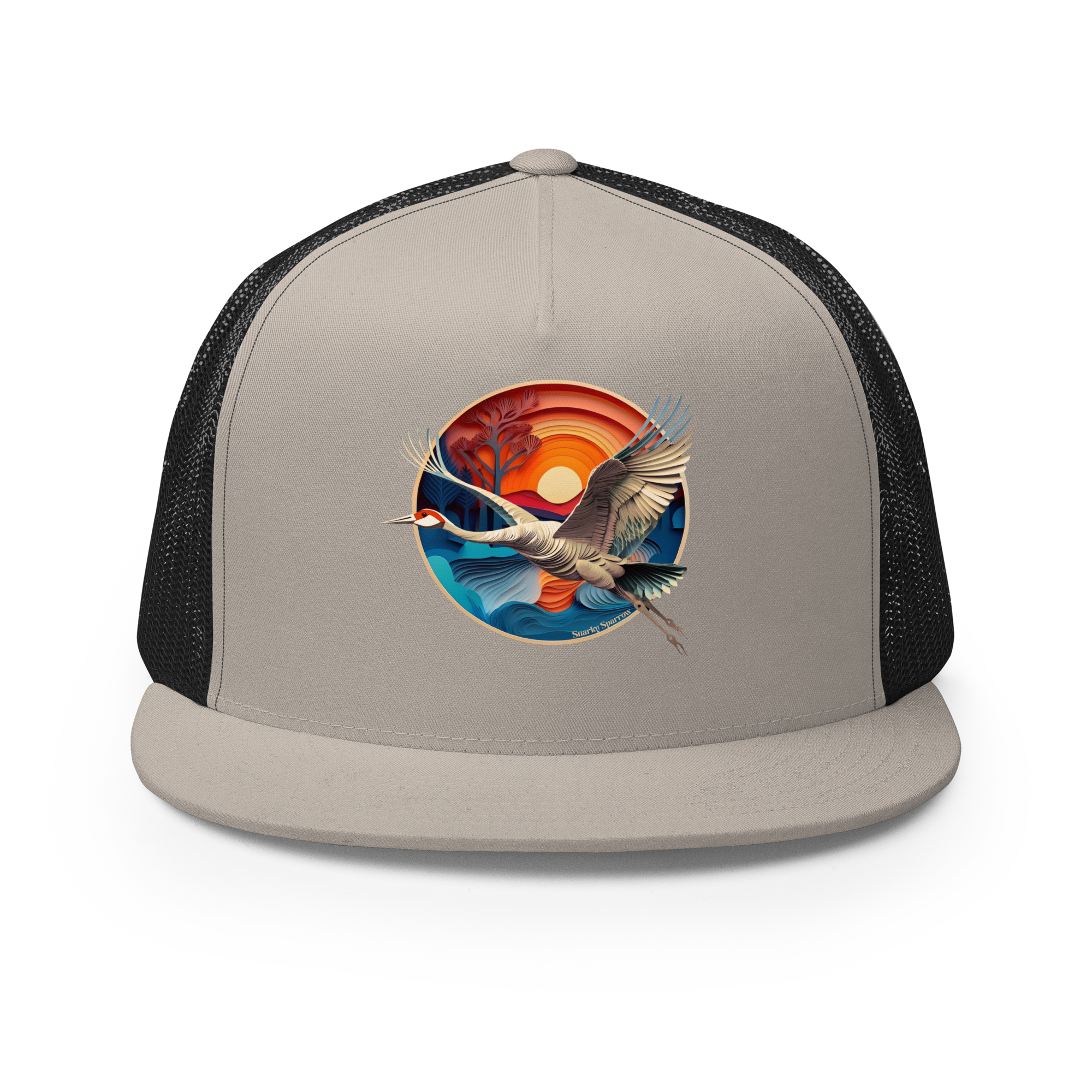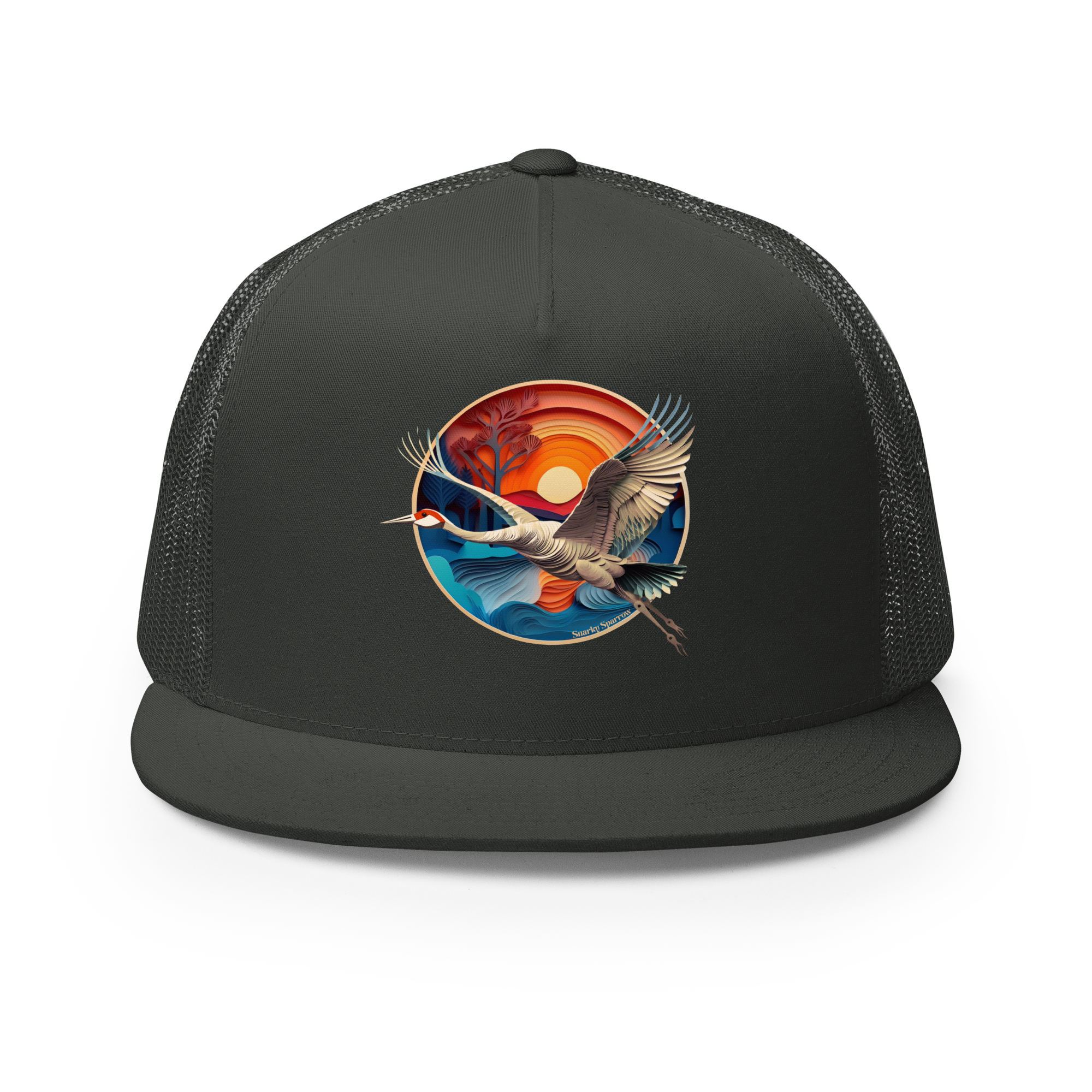 Soar to new heights with the Rising Crane flat-bill trucker hat! 🧢🌅 Featuring a majestic sandhill crane in flight, framed by a stunning layered sunset and river scene, this design captures the beauty of nature in bold, artistic detail.
